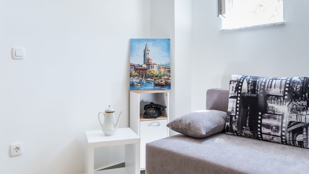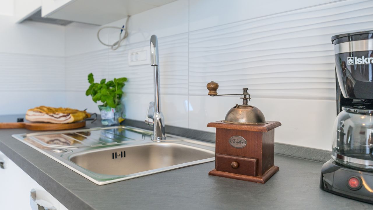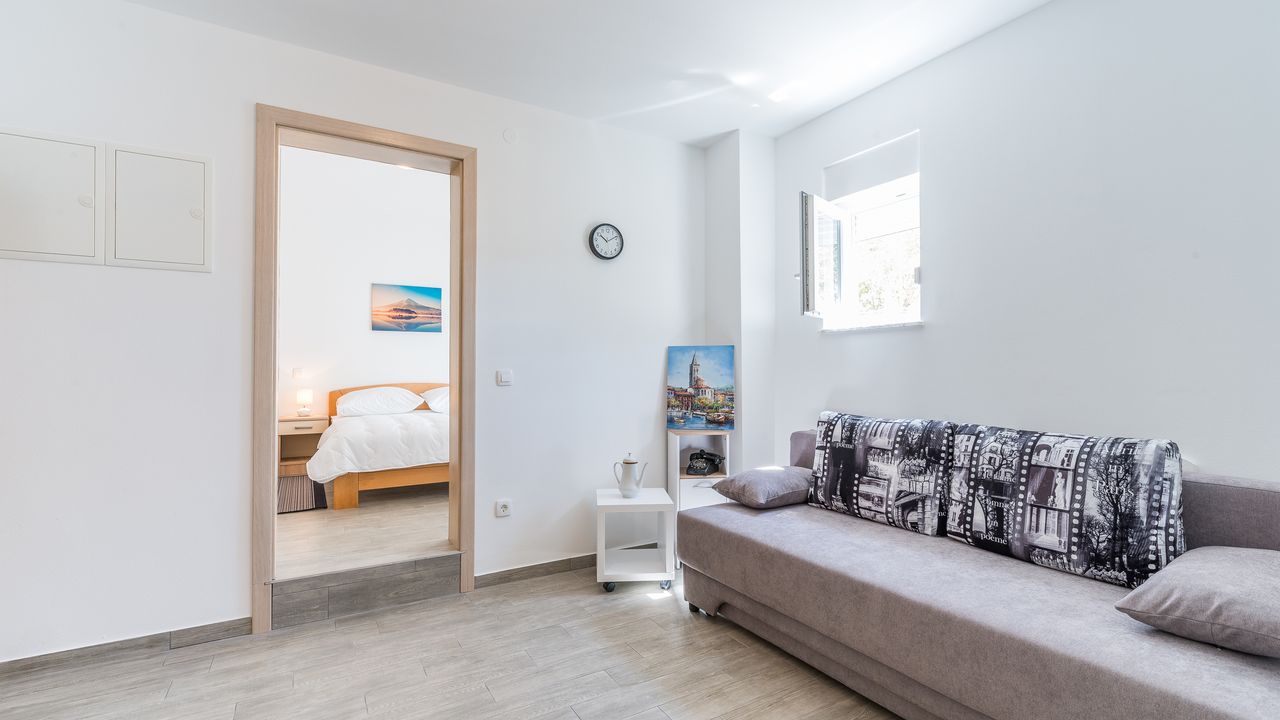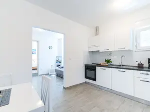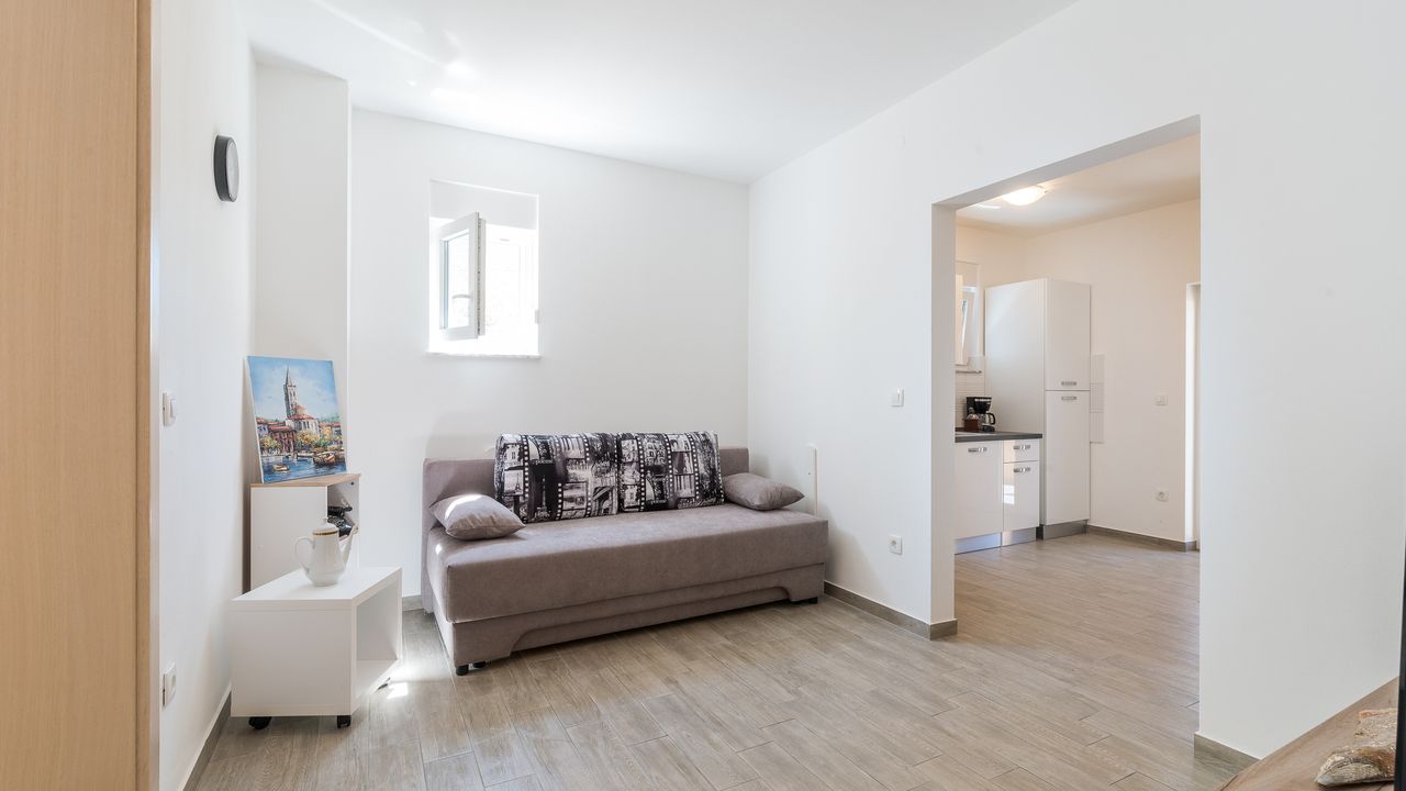 Modern eingerichtete Wohnung (45 m²) mit 4 * und ein Meerblick befindet sich in einer ruhigen Gegend in Privlaka, nur 8 km von der Inseln Vir.Die Nähe des Meeres und das umliegende mediterrane Grün machen diese Wohnung zu einem idealen Ort, um sich zu entspannen und dem Alltag zu entfliehen. Diese luxuriöse FeWo für 2 Personen befindet sich im Erdgeschoss und ist in ein Wohnzimmer mit Küche und Esszimmer, ein Doppelzimmer mit Doppelbett und ein Badezimmer mit Dusche aufgeteilt. Die Wohnung hat zwei überdachte und möblierte Terrassen mit Meerblick .Zu den weiteren Annehmlichkeiten gehören Klimaanlage, Sat-TV und Internet per WLAN .Im geräumigen Innenhof (1500 m²) gibt es Parkplatz, Grill, Sonnendeck mit Liegen und Außendusche. Entfernung zum Strand mit betonierte Liegeflächen und Pinienwald ist nur 30 m.