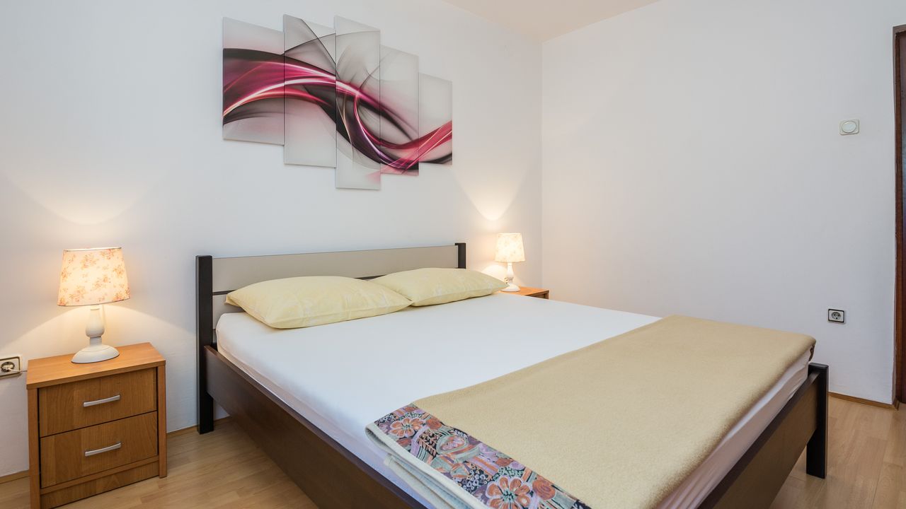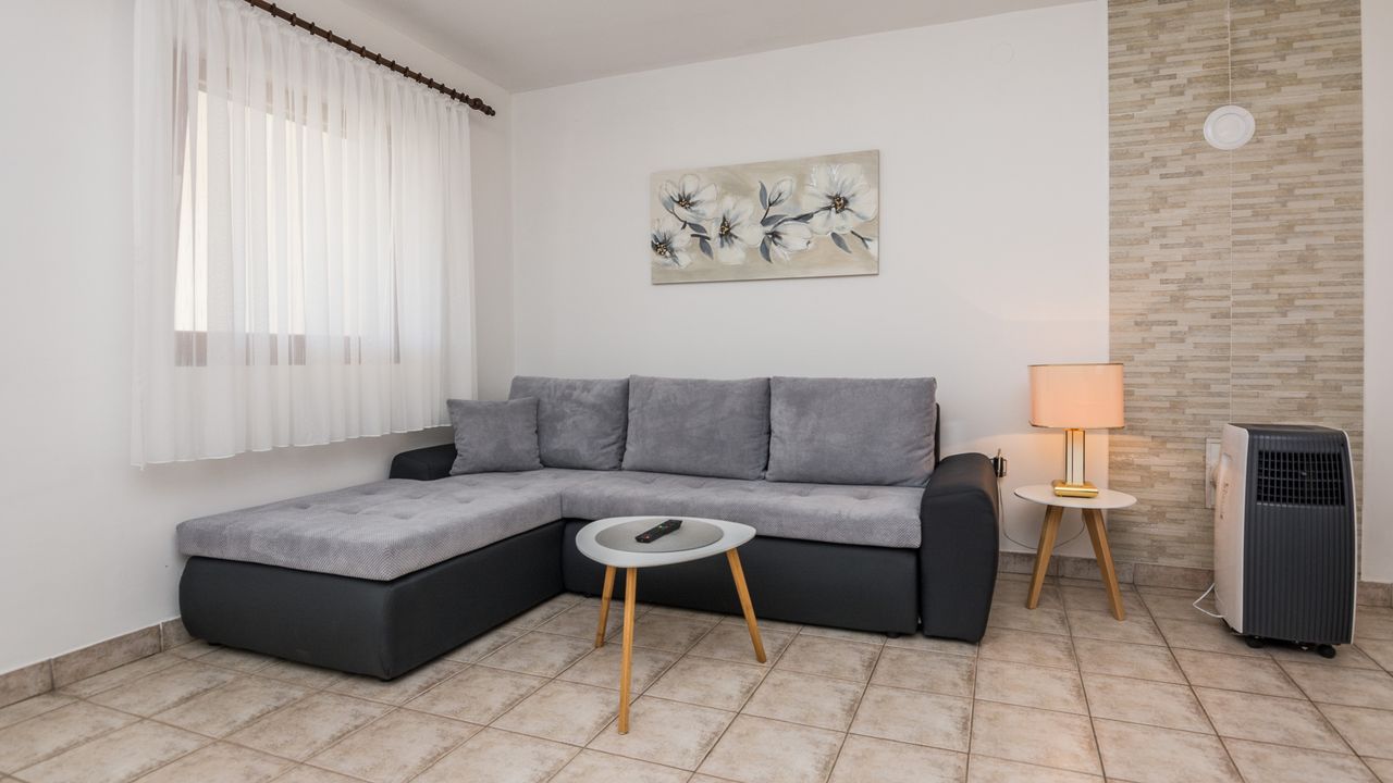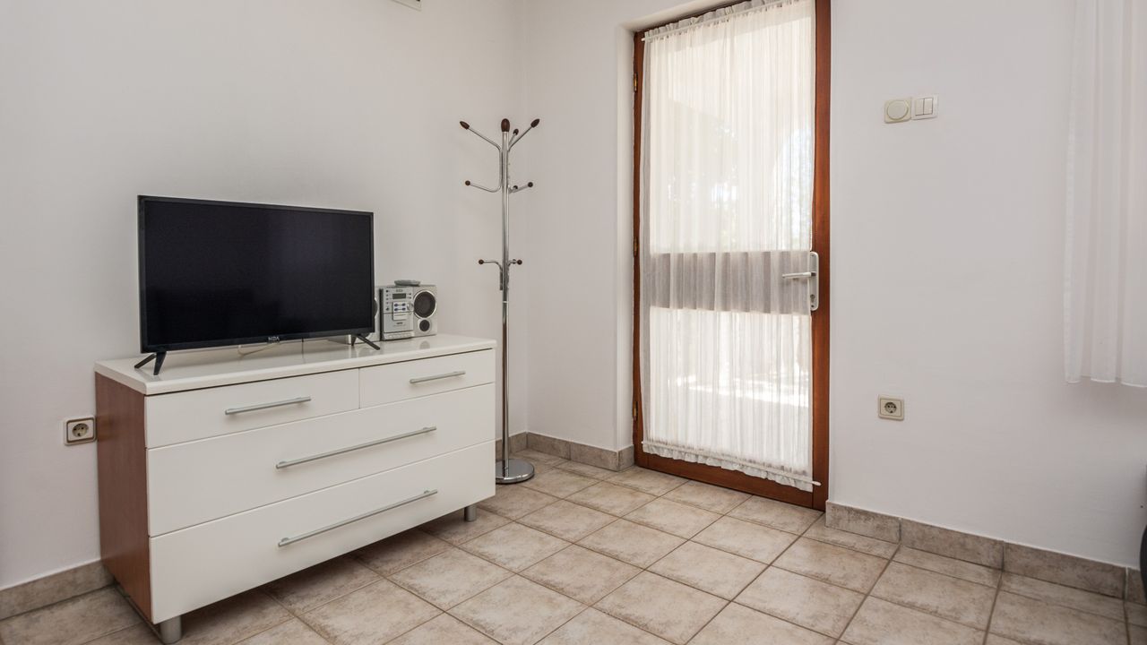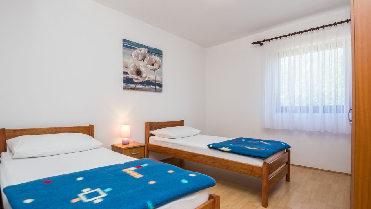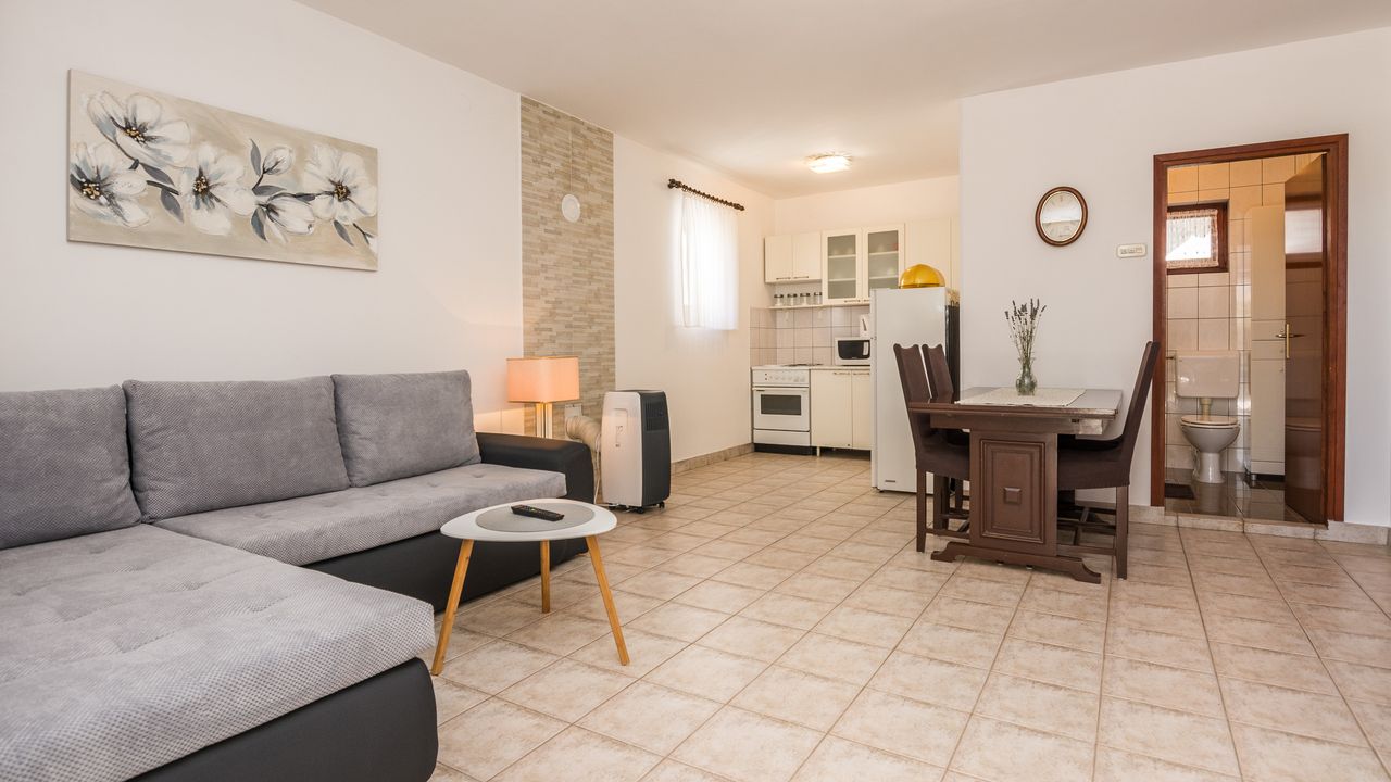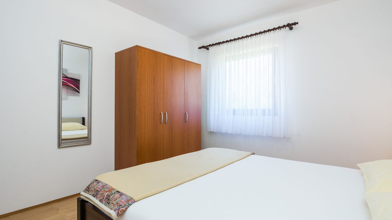 Dieser 65 m² Appartement im Zentrum der Insel Vir ideal für 2-4 Personen ist nur 300 m von Strand Jadro entfernt.Das Appartement im Erdgeschoss des Hauses teilt sich auf ein Wohnbereich und Esszimmer mit voll ausgestattet Küche, Doppelzimmer mit Doppelbett, Schlafzimmer mit zwei Einzelbetten, ein Badezimmer mit Dusche und 15 m² überdachte und möblierte Terrasse. Parkplatz auf dem Grundstück, Waschmaschine, Klimaanlage und Garten mit Grill zählen zu den weiteren Ausstattungsmerkmalen. Dieser beliebter Kieselstrand Jadro mit zahlreichen Freizeit- und Unterhaltungsprogrammen für Kinder und Erwachsene ist eine Promenade entlang die Küste. Ideal für entspannende Abendspaziergänge. Ein Restaurant, das Zentrum der Insel Vir und ein Geschäft sind nur 300 m entfernt.