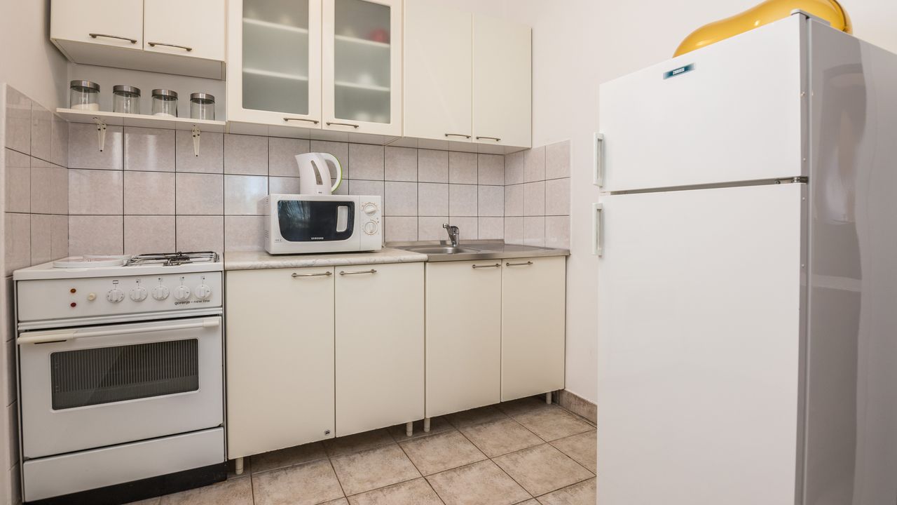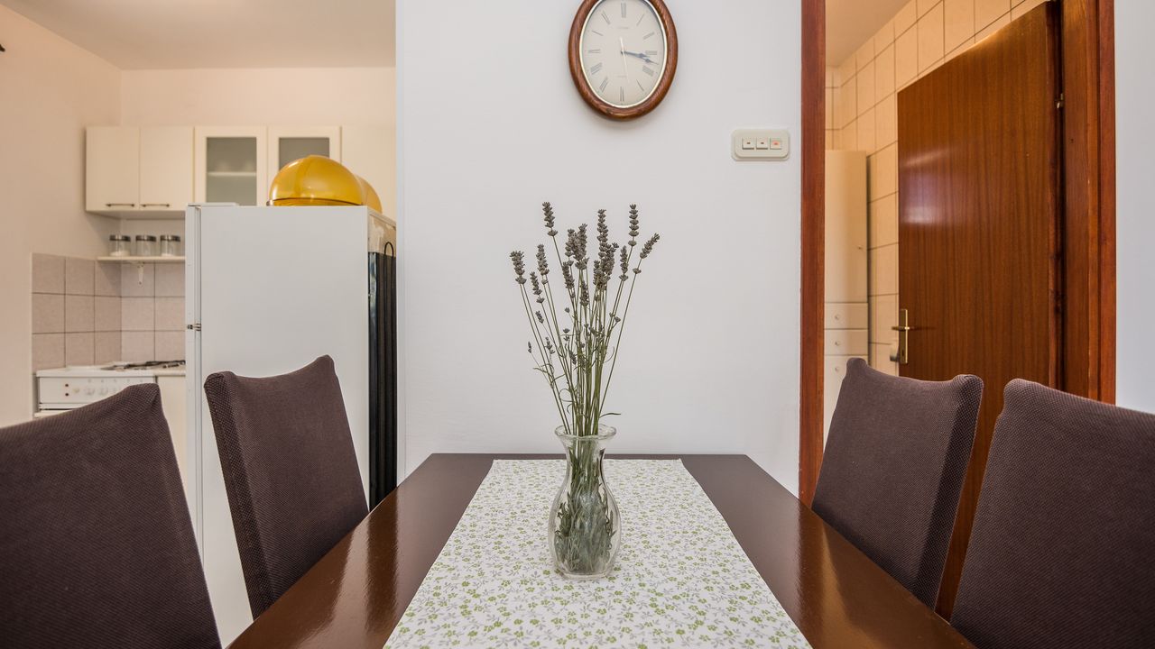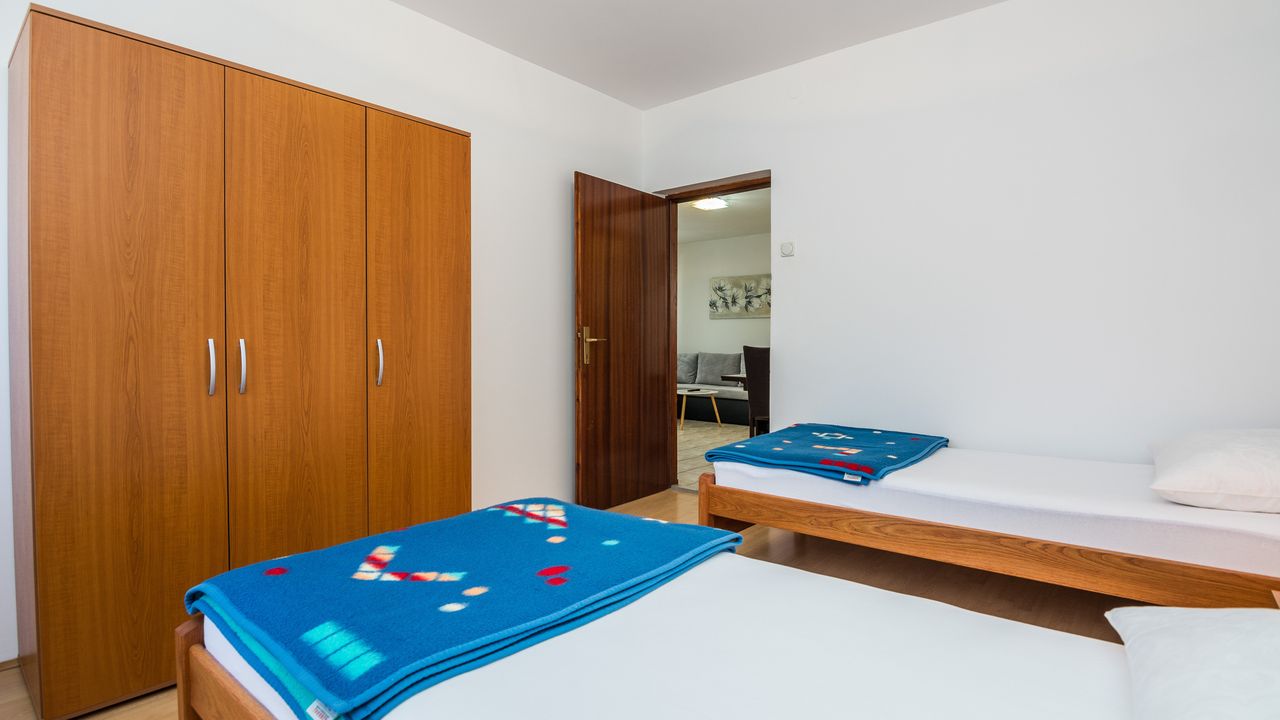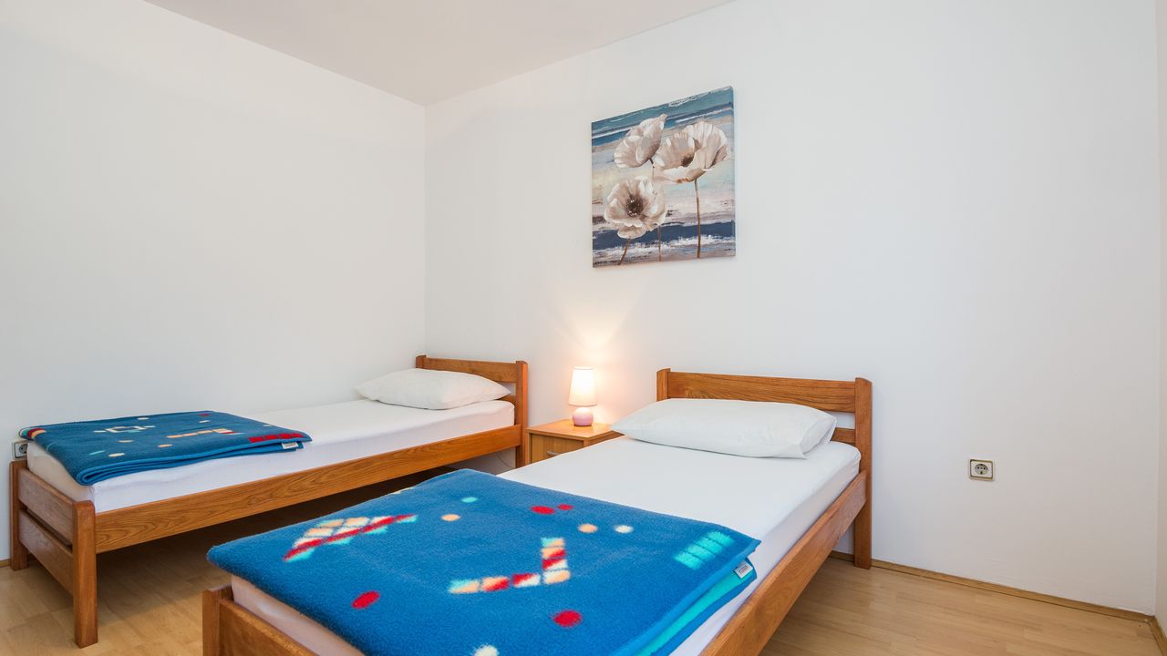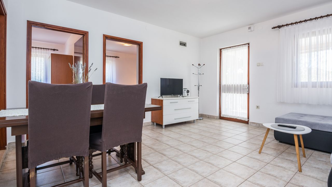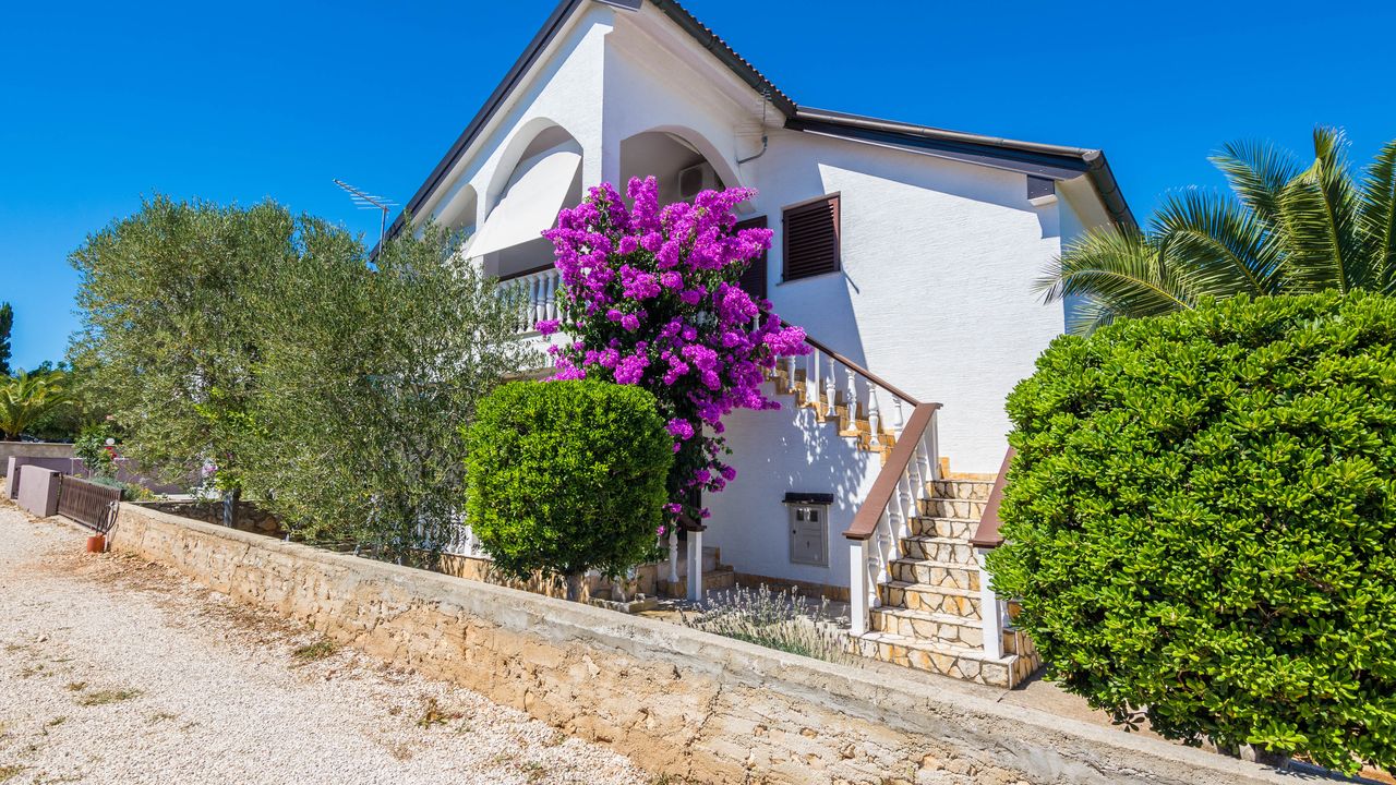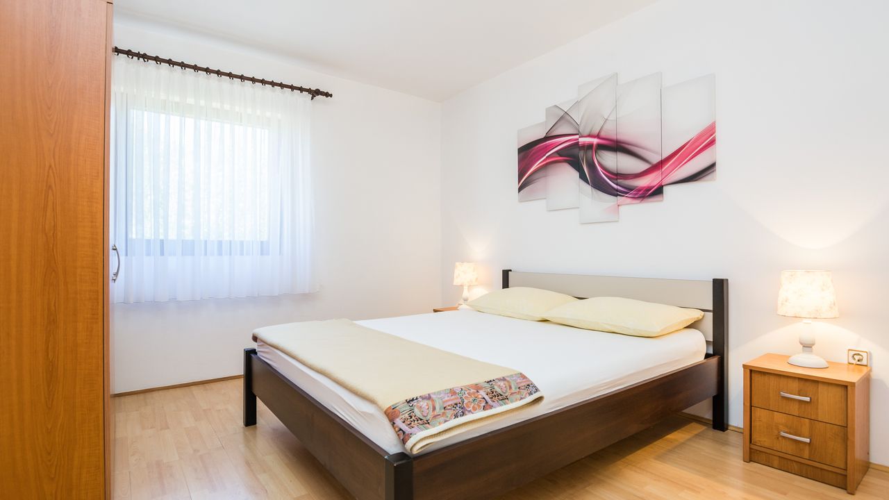Dieser 65 m² Appartement im Zentrum der Insel Vir ideal für 2-4 Personen ist nur 300 m von Strand Jadro entfernt.Das Appartement im Erdgeschoss des Hauses teilt sich auf ein Wohnbereich und Esszimmer mit voll ausgestattet Küche, Doppelzimmer mit Doppelbett, Schlafzimmer mit zwei Einzelbetten, ein Badezimmer mit Dusche und 15 m² überdachte und möblierte Terrasse. Parkplatz auf dem Grundstück, Waschmaschine, Klimaanlage und Garten mit Grill zählen zu den weiteren Ausstattungsmerkmalen. Dieser beliebter Kieselstrand Jadro mit zahlreichen Freizeit- und Unterhaltungsprogrammen für Kinder und Erwachsene ist eine Promenade entlang die Küste. Ideal für entspannende Abendspaziergänge. Ein Restaurant, das Zentrum der Insel Vir und ein Geschäft sind nur 300 m entfernt.