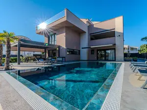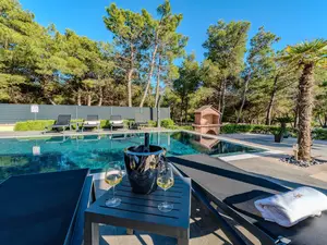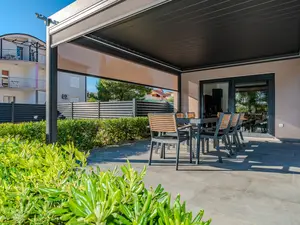 Dieses Apartment im Erdgeschoss ist ideal für 6-8 Personen. Es befindet sich in einer ruhigen Lage der Insel Vir namens Site.Das Apartment ist aufgeteilt in ein Wohnzimmer mit voll ausgestatteter Küche und Essbereich, drei klimatisierte Schlafzimmer mit Doppelbetten, die mit Sat-TV ausgestattet sind, und zwei Badezimmer mit Dusche, eines davon gehört zum Schlafzimmer. Das Wohnzimmer hat ein Schlafsofa für zwei weitere Personen. Zur Wohnung gehört eine 25 m² große überdachte Terrasse mit Tisch und Stühlen. Der Innenhof des Apartments verfügt über einen beheizter Swimmingpool und einen Entspannungsbereich mit Grill, Pavillon, Liegen und Sonnenschirm.