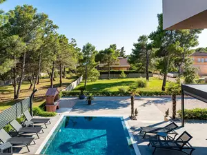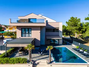 Dieses Apartment befindet sich am ersten Stock und ist ideal für 4-6 Personen. Es befindet sich in einer ruhigen Lage der Insel Vir namens Site.Das Apartment ist aufgeteilt in ein Wohnzimmer mit voll ausgestatteter Küche und Essbereich, zwei klimatisierte Schlafzimmer mit Doppelbetten, die mit Sat-TV ausgestattet sind, und drei Badezimmer mit Dusche, davon zwei gehört zu den Schlafzimmern. Das Wohnzimmer hat ein Schlafsofa für zwei weitere Personen. Zur Wohnung gehört eine 25 m² große überdachte Balkon mit Tisch und Stühlen. Der Innenhof des Apartments verfügt über einen beheizter Swimmingpool und einen Entspannungsbereich mit Grill, Pavillon, Liegen und Sonnenschirm.