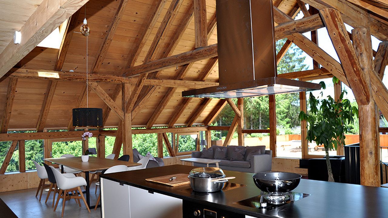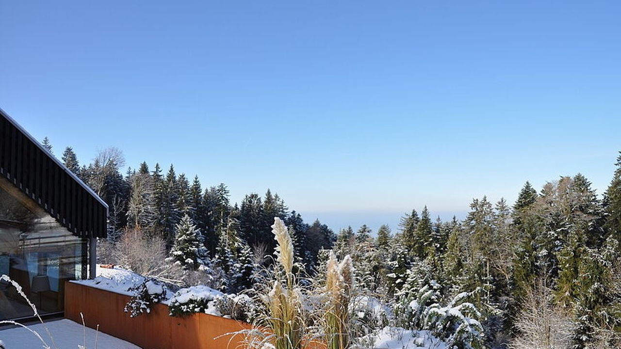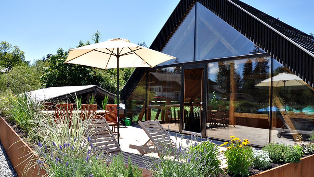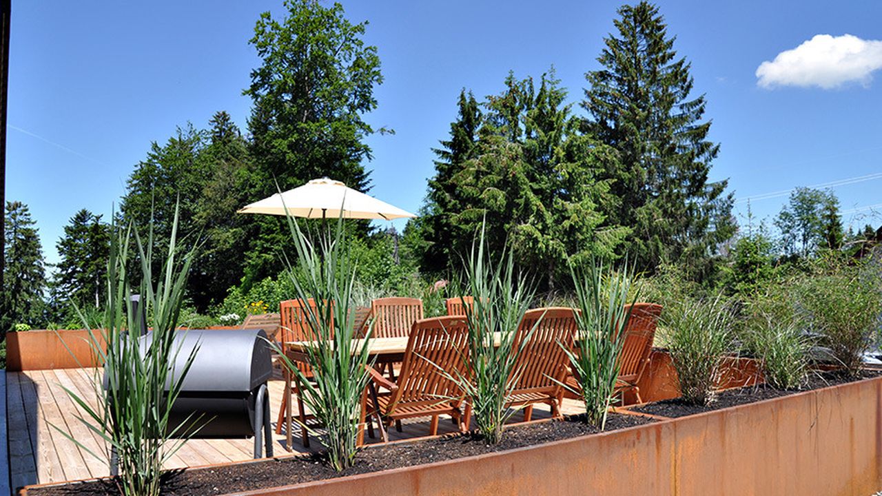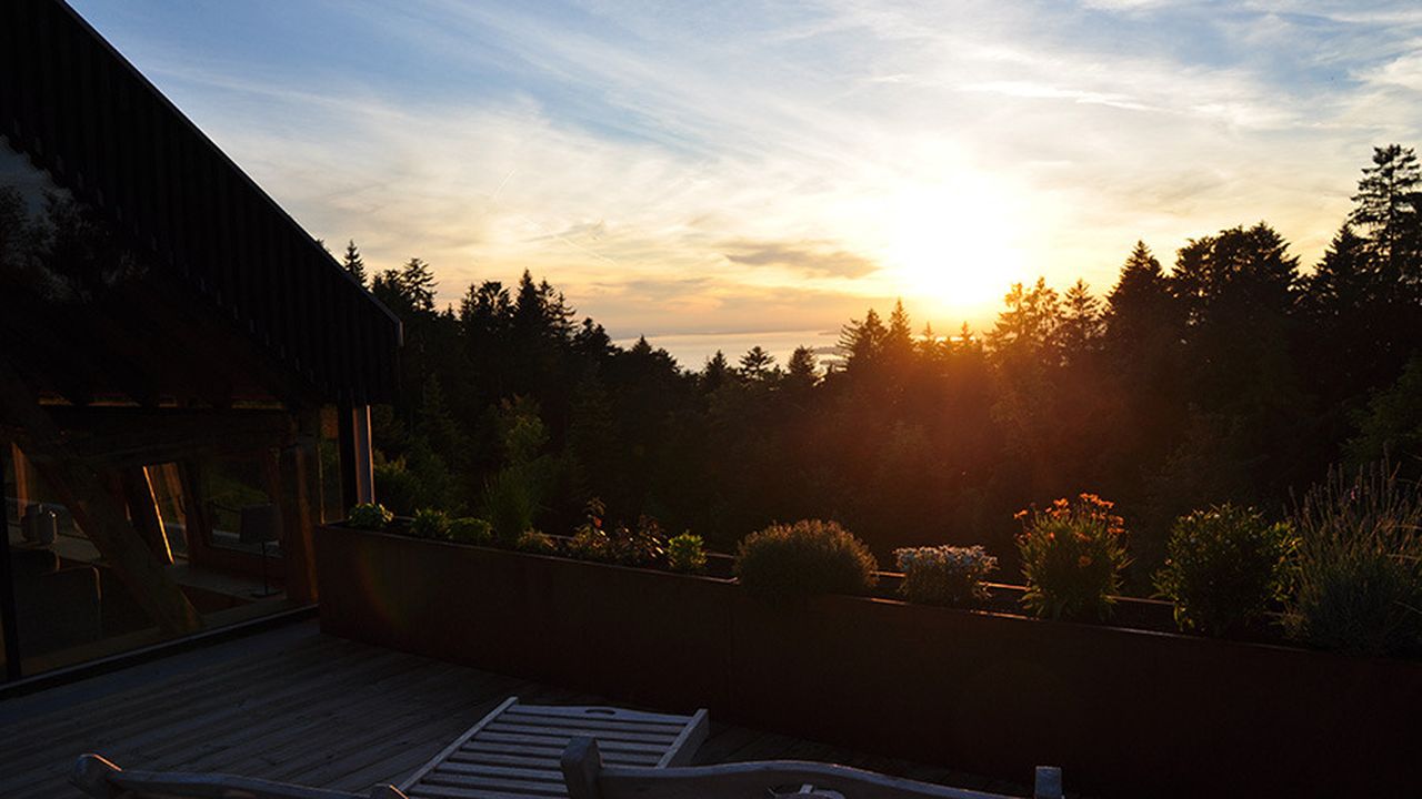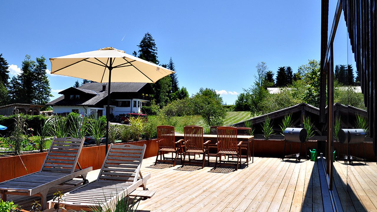 Auf der Großen, mit Pflanzen umsäumten Terrasse können sie den ganzen Tag einen wunderschönen Blick in die umliegende Natur mit viel Grün und Bergen, sowie atemberaubende Sonnenuntergänge über dem Bodensee erleben. Die Terrasse ist mit einem Holzgrill, einer großen, automatischen Markise sowie Sitz- und Liegemöglichkeiten ausgestattet.