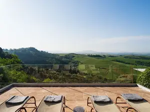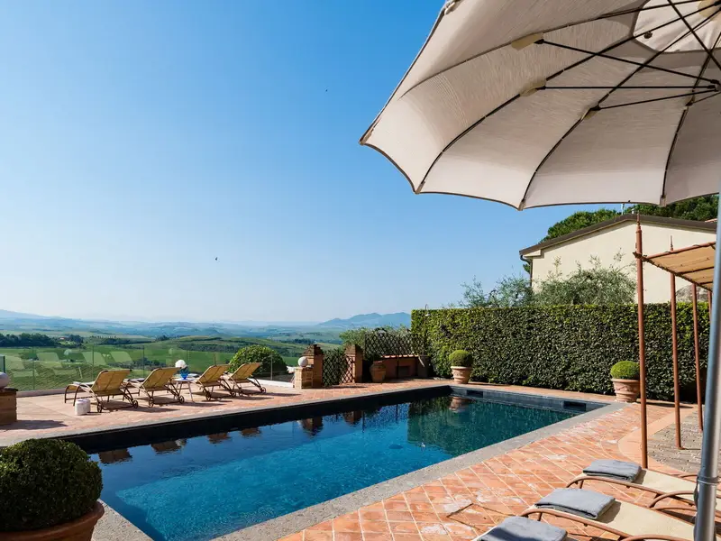 Eine gemauerte Treppe führt zum Poolbereich , der mit einem Solarium mit Liegestühlen und Sonnenschirmen sowie einem Pavillon mit Gartenmöbeln und Sitzgelegenheiten ausgestattet ist. Vom Swimmingpool und vom Garten aus können Sie eine spektakuläre Landschaft genießen, reich an Weinbergen und Hügeln, die bis zur schönen Stadt Volterra reichen.