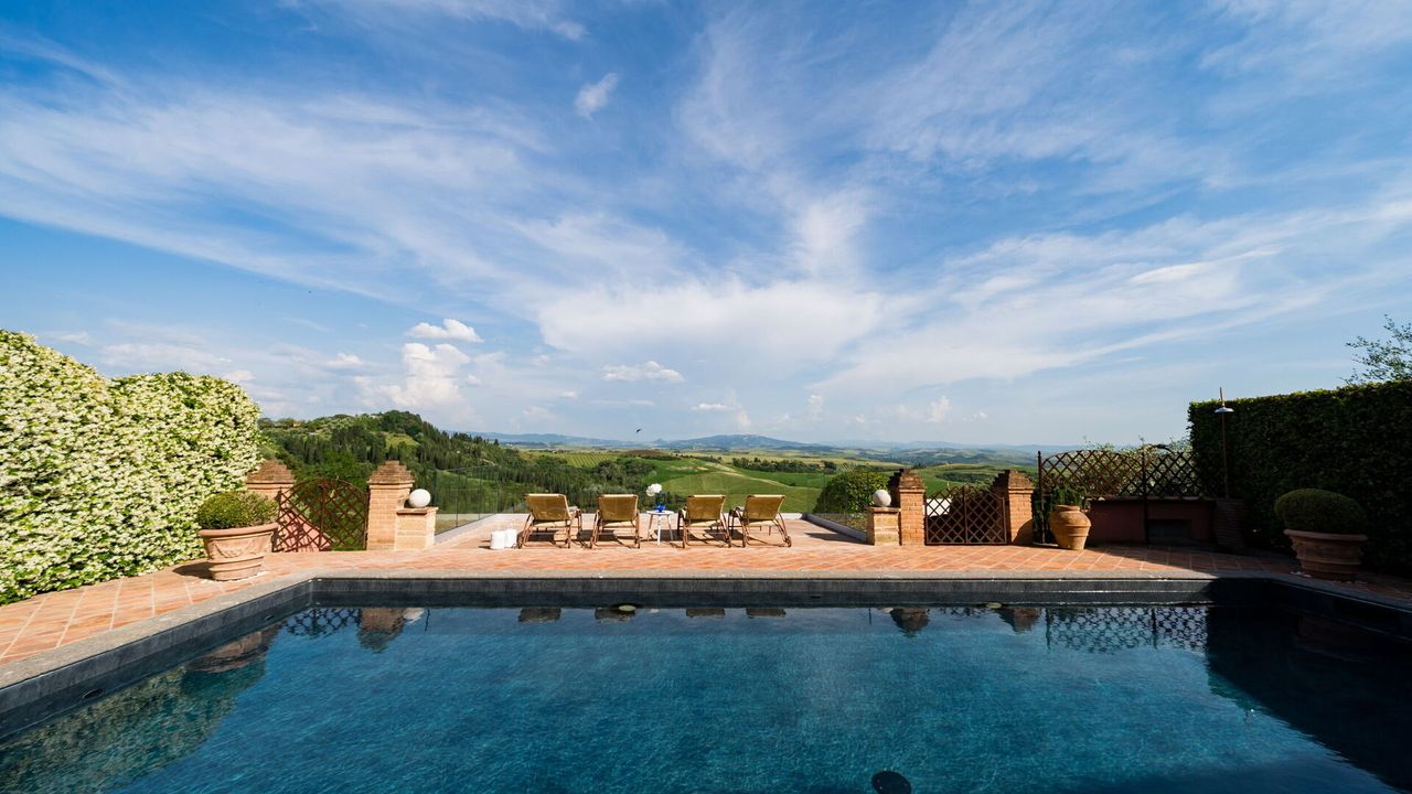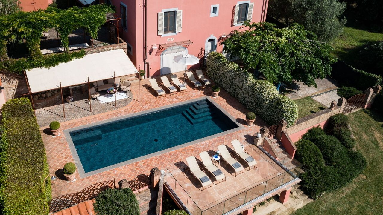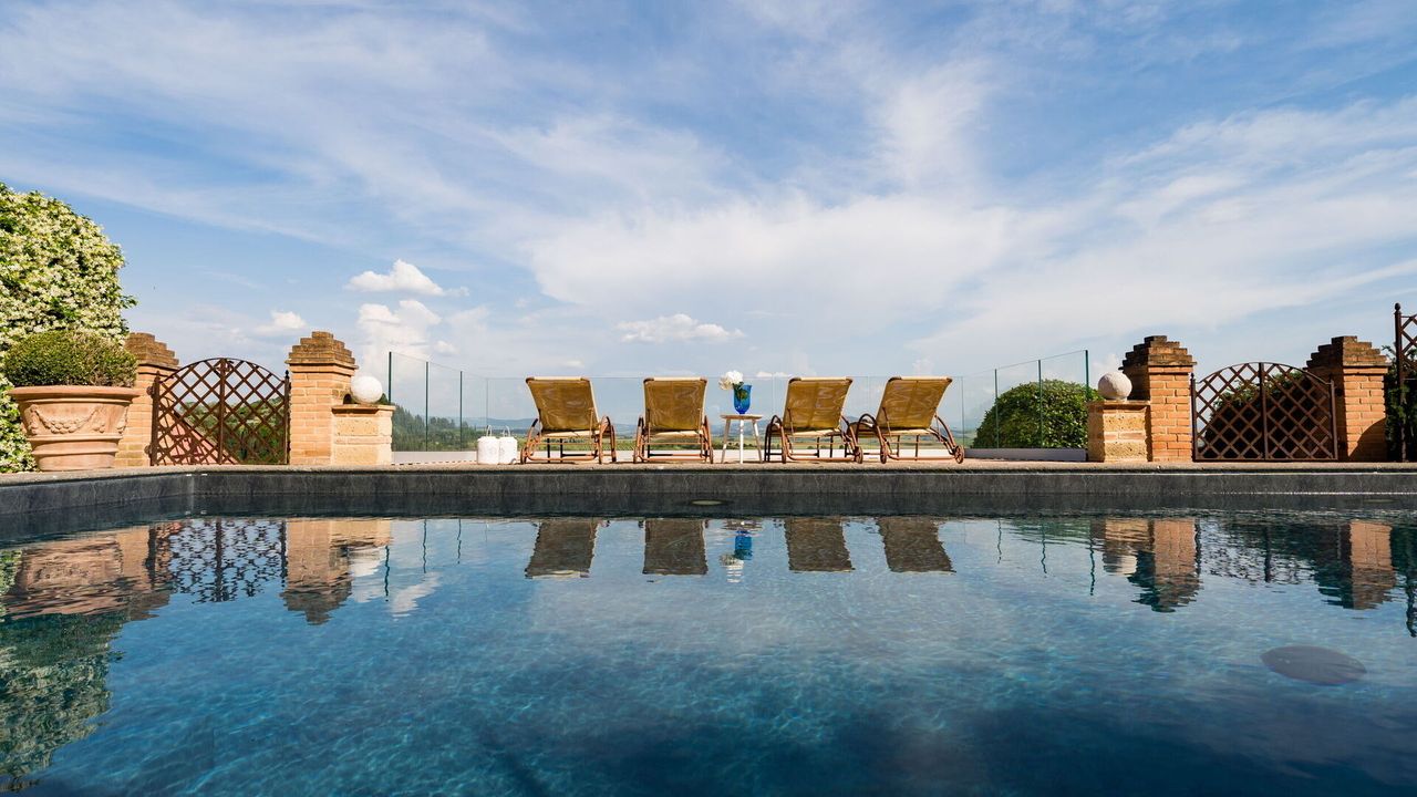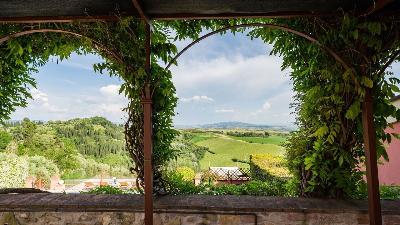 Eine gemauerte Treppe führt zum Poolbereich (12 m x 4 m mit einer festen Tiefe von 1,30 m und einem Bereich mit Hydromassage, geöffnet vom 1. Mai bis 30. Oktober, mit Salzwasser), der mit einem Solarium mit Liegestühlen und Sonnenschirmen sowie einem Pavillon mit Gartenmöbeln und Sitzgelegenheiten ausgestattet ist. Vom Swimmingpool und vom Garten aus können Sie eine spektakuläre Landschaft genießen, reich an Weinbergen und Hügeln, die bis zur schönen Stadt Volterra reichen.