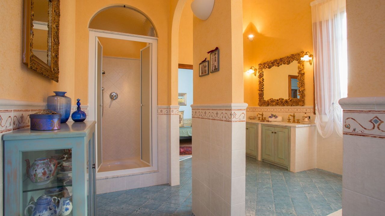 Vom Haupteingang gelangt man in das Atrium, das mit den Zimmern im Erdgeschoss verbunden ist. Hier befinden sich die gut ausgestattete Einbauküche mit direktem Zugang zur Außenpergola, das große Esszimmer mit einem schönen Kristalltisch, das Wohnzimmer mit Kamin, Sofas, Sesseln, Satellitenfernsehen und direktem Zugang zum Garten, das Arbeitszimmer und das Doppelzimmer (das in ein Einzelzimmer umgewandelt werden kann) mit eigenem Bad mit Dusche.