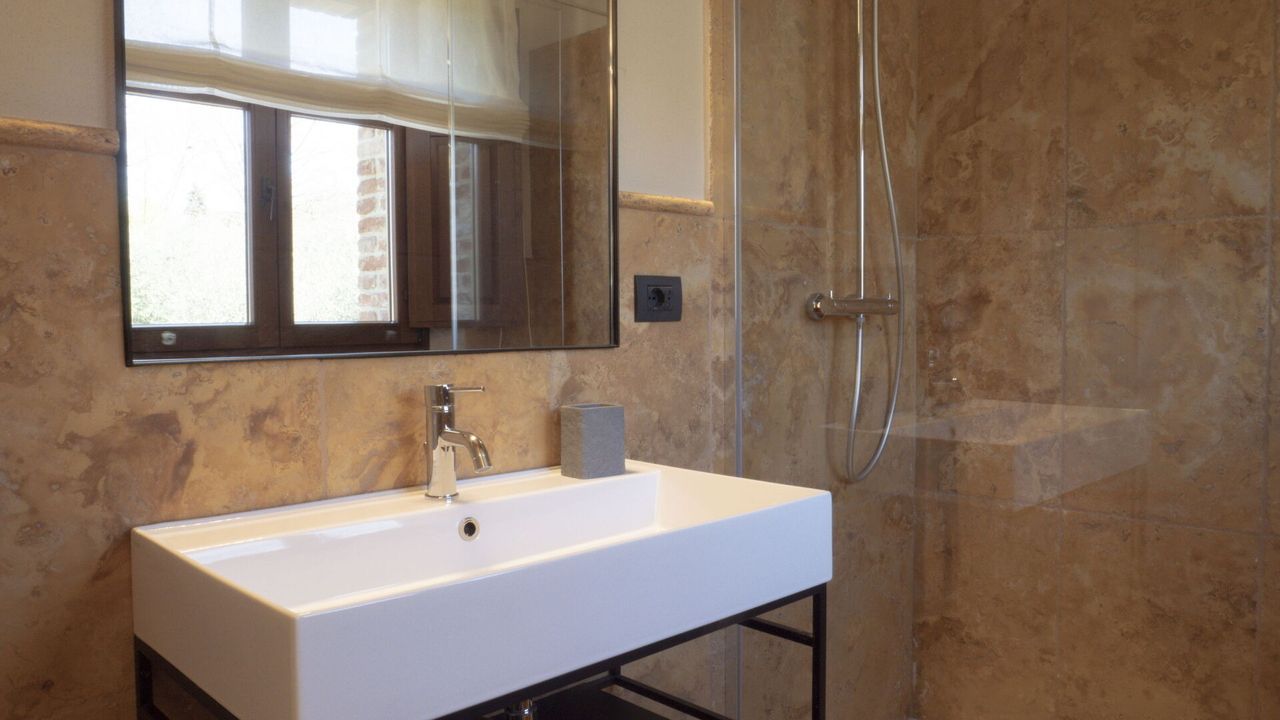 Das Nebengebäude erstreckt sich ebenfalls über drei Ebenen: Im Erdgeschoss befindet sich eine komplett ausgestattete Küche mit Wohnzimmer und im ersten Stock ein Doppelzimmer mit eigenem Bad und Kleiderschrank.