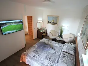Auf der Flaeche von elegant und modern eingerichteten 26 m2 des Deluxe-Zimmers mit extra grossem Doppelbett und zusätzlicher Kautsch koennen sich die Gaeste von der Pension Silvia wirklich erholen und ihren Urlaub geniessen. Dieses einzigartige Angebot sichert den Gästen den zauberhaften Meerblick aus dem grossen Balkon. Neben dem eigenen Badezimmer mit Dusche stehen den Gaesten zur Verfuegung noch folgende Einrichtungen, wie zum Beispiel TV mit Satellit-Programmen, Kühlschrank und Klimaanlage.