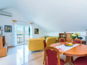 Ferienwohnung für 4-6 Personen im zweiten Stock des Hauses mit Meerblick befindet sich in einer ruhigen Gegend der Insel Vir-Bobovik.Die Wohnung ist aufgeteilt in ein Wohnzimmer mit Küche und Esszimmer, zwei Doppelzimmer mit Doppelbett und ein Badezimmer mit Dusche. Im Wohnzimmer befindet sich ein Schlafsofa für zwei weitere Personen. Vom Wohnzimmer aus gelangt man auf eine möblierter 16 m² Balkon. Zu den weiteren Annehmlichkeiten gehören Klimaanlage, SAT TV, WLAN. Kinderbett auf Anfrage. Eine gemeinsame Lounge befindet sich im Keller des Hauses die umfasst eine Bar, Sitzplätze, Darts, SAT TV, Radio, Klimaanlage und Kühlschrank mit Gefrierfach. Hinter dem Haus gibt es einen Parkplatz für Fahrräder. Im geräumigen Innenhof des Hauses befindet sich ein Pavillon mit Grill und Gartenmöbeln, ideal für Versammlungen in warmen Sommerabenden. Die Wohnung befindet sich in einer Entfernung von 70 m vom Meer und 150 m von Shops und Restaurants. Haustiere sind gegen einen Aufpreis von 15 EUR pro Tier und Nacht willkommen.