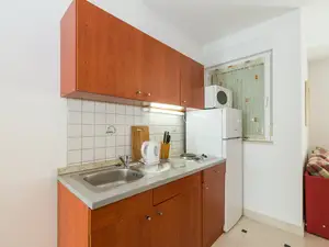 Ferienwohnung für 3-5 Personen im Erdgeschoss des Hauses mit teilweiser Meerblick befindet sich in eine ruhige Gegend der Insel Vir-Bobovik.Die Wohnung ist aufgeteilt in ein Wohnzimmer mit Küche und Esszimmer, ein Doppelzimmer mit Doppelbett, ein Einzelzimmer mit einem Bett für eine Person und ein Badezimmer mit Dusche. Im Wohnzimmer befindet sich ein Schlafsofa für zwei weitere Personen. Vom Wohnzimmer aus gelangt man auf eine möblierte und überdachte 8 m² Terrasse. Zu den weiteren Annehmlichkeiten gehört eine Klimaanlage, SAT-TV, WLAN. Kinderbett auf Anfrage. Eine gemeinsame Lounge befindet sich im Keller des Hauses die umfasst eine Bar, Sitzplätze, Darts, SAT TV, Radio, Klimaanlage und Kühlschrank mit Gefrierfach. Hinter dem Haus gibt es einen Parkplatz für Fahrräder. Im Innenhof des Hauses befindet sich ein Pavillon mit Grill und Gartenmöbeln, ideal für Versammlungen in warmen Sommerabenden. Die Wohnung befindet sich in einer Entfernung von 70 m vom Meer und ist 150 m von den Shops und Restaurants entfernt. Haustiere sind gegen einen Aufpreis von 15 EUR pro Tier und Nacht willkommen.