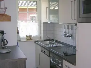 Eine kompl. ausgestattete moderne Küche, ein heller freundlicher Wohn-Essraum mit gemütlichen Sofas u. Sessel sowie einem Essplatz und Ausgang zur Terrasse u. Garten.