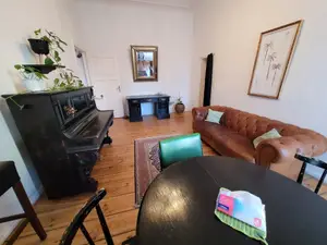 Willkommen zu Hause in dieser wunderschön erhaltenen Altbauwohnung aus den 1920er Jahren, die sich im pulsierenden Herzen von Berlin-Mitte in der Brüsseler Straße befindet. Mit 3 Zimmern, 2 Doppelbetten und reichlich Platz für bis zu 4 Personen ist sie eine seltene Mischung aus historischem Charme und modernem Komfort. Wenn Sie die Wohnung betreten, spüren Sie sofort den Charakter des Raumes: 4 Meter hohe Decken, originale Stuckverzierungen und elegante Holzböden. Das Wohnzimmer verfügt über ein klassisches britisches Sofa (importiert aus London, wo Pete Doherty früher übernachtete) und ein antikes Klavier – perfekt für entspannte Abende oder einen Hauch von Inspiration.Die kleine Küche und das kleine Badezimmer wurden vor vier Jahren komplett renoviert und bieten hochwertige Armaturen, klare Linien und eine helle, frische Atmosphäre. In der kleinen Küche finden Sie alles, was Sie brauchen: Kühlschrank, Gefrierschrank, Backofen, Wasserkocher, Besteck und Kochgeschirr, damit Sie problemlos kochen können.Weitere Annehmlichkeiten sind: