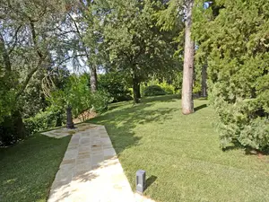 Die Villa hat ein Eingangstor und einen Parkplatz.