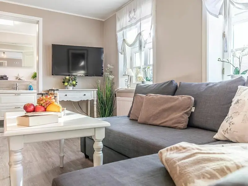 In der Wohnstube mit Flat TV befindet sich eine gemütliche Sofaecke und eine Sitzgruppe wo man bei einem leckeren Frühstück den Tag beginnen kann.Die separate Küche ist selbstverständlich mit allem Komfort ausgestattet ( großer