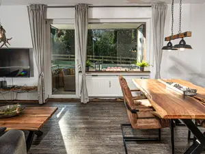 Ein typischer "Blockhaus-Charakter" sorgt in diesem Apartment für ein warmes, angenehmes Ambiente.Unser 70 m² großes Apartment wurde 2018 komplett neu saniert. Es ist im Alpen-Chalet-Stil mit neuen Möbeln, neuem Badezimmer und einer neuen Küche mit freiem WLAN technisch auf dem neuesten Stand. Das Apartment liegt direkt am "Erlebnisberg – Bocksberg", mit seinen vielen Attraktionen und hat einen unverbaubaren Blick ins Grüne.