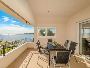 Dieses moderne Apartment im ersten Stock ist ideal für 4-6 Personen. Das Apartment direkt am Strand befindet sich in einem ruhigen Teil der Gemeinde Privlaka.Die 60 m² große Wohnung ist aufgeteilt in ein Wohnzimmer, eine voll ausgestattete Küche mit Essbereich, zwei Schlafzimmern (eines mit Doppelbett und eines mit zwei Einzelbetten) und ein Badezimmer mit Dusche. Alle Zimmer sind klimatisiert. Im Wohnzimmer befindet sich ein Schlafsofa für zwei Personen. Zur FeWo gehört eine 12 m² großer überdachter Balkon mit Meerblick, möbliert mit Liegen, Tisch und Stühlen.