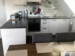 Der elegante Essbereich mit gemütlichen Freischwinger-Stühlen bietet genügend Raum für gemeinsame Mahlzeiten. In der modernen Pantryküche finden Sie alles, was das Herz begehrt: Cerankochfeld, Backofen, Geschirrspüler, Kaffeemaschine, Wasserkocher, Toaster und einen exklusiven Weinkühlschrank – ideal für Genießer.