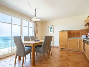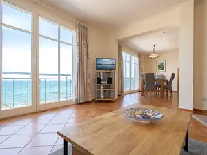 Der lichtdurchflutete Wohn- und Essbereich bietet dank der großen Fensterfront einen atemberaubenden Ausblick auf das Meer. Entspannen Sie sich auf der modernen Wohncouch oder lassen Sie sich von einem Flatscreen-TV und Radio unterhalten. Vom rustikalen Echtholz-Esstisch aus, an dem 6 Personen Platz finden, können Sie nicht nur gemeinsam speisen, sondern auch die wunderschöne Aussicht auf Strand und Promenade genießen.