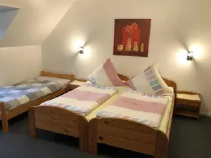Geräumige Ferienwohnung, 80 qm, parterre und im Obergeschoss mit 2 Schlafräume mit 2 und 3 Betten, Zustellbett möglich, Wohnzimmer, große komplett eingerichtete Küche mit Geschirrspüler, Bad u. Du/WC, Flur.Sonstiges