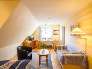 1-Raum-Ferienwohnung für 1-2 Personen - 28 qm - Dachgeschoß, Dünenweg 16 - Wohnung "Blauer Salon". Wohn-Schlafraum: Ehebett , Couch, 1 Sessel, TV, Esstisch mit 2 Stühlen, Laminatfußboden. Küche: 4-Platten-Cerankochfeld, Backofen, Geschirrspülmaschine, Kühlschrank, Spüle, kompl. ausgestattet mit Geschirr und Hausrat, Esstisch mit 2 Stühlen, Fliesenboden. Bad: Dusche, WC, Waschbecken, Ablage, Fliesenboden. WLAN wird kostenlos angeboten - eine Gewähr auf Verfügbarkeit besteht nicht. Haustiere sind in dieser Wohnung nicht gestattet.Beschreibung der Unterkunft