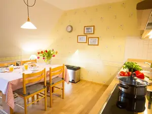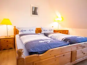 2-Raum-Ferienwohnung für max. 2 Erwachsene - 45 qm im Dachgeschoß + Spitzboden, Dünenweg 16 - Wohnung "Glockenblume". Wohnraum im Spitzboden: Schlafcouch, Couchtisch, 2 Sessel, TV, Laminatboden. Schlafraum: Ehebett , mit 2 Nachttischen, Kleiderschrank, Laminatboden. Küche mit 4-Platten-Cerankochfeld, Backofen, Kühlschrank, Spüle, Geschirrspülmaschine, kompl. ausgestattet mit Geschirr und Hausrat, Esstisch + 4 Stühle, Treppe zur Galerie mit Wohnschlafzimmer, Laminatboden. Bad: Dusche, WC, Waschbecken, Ablage, Fliesenboden. WLAN wird kostenlos angebote - ein Gewähr auf Verfügbarkeit besteht nicht. Haustiere sind in dieser Wohnung nicht gestattet.Beschreibung der Unterkunft