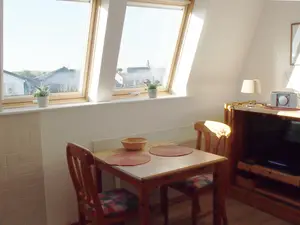2-Raum-Ferienwohnung für 2 Personen - 28 qm - Dachgeschoß. Wohnraum: 2 Sessel, Couchtisch, Esstisch m. 2 Stühlen, Schrank, TV, Fußbodenbelag: Vinyl-Parkett, Küchenzeile: 4-Platten-E-Herd, Backofen, Kühlschrank, Spüle, Geschirrspüler, Dunstabzug, Geschirr und Haurat, Fliesenboden. Schlafraum mit Ehebett (2x90X200), Lattenrost höhenverstellbar, Kleiderschrank, Fußbodenbelag: Vinyl-Parkett. Bad: Dusche mit Schiebetür, WC, Waschbecken, Ablage, Fußbodenbelag: Fliesen. Nichtraucherwohnung.Beschreibung der Unterkunft