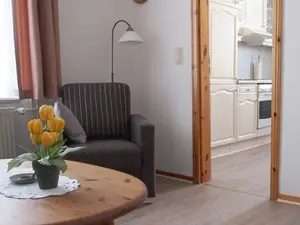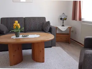 2-Raum-Ferienwohnung für 1-3 Personen - 50 qm - 2. OG. Wohnraum: Schlafcouch (140X200), Couchtisch, 1 Sessel, Schrank, TV, Vinyl-Parkett. Schlafraum: Ehebett (2x90x200), Lattenrost höhenverstellbar, Kleiderschrank, Fußbodenbelag: Vinyl-Parkett. Küche: 4-Platten-E-Herd mit Backofen, Kühlschrank, Spüle, Geschirrspülmaschine, Dunstabzug, Mikrowelle, Geschirr und Hausrat, Esstisch mit 4 Stühlen, Fußbodenbelag: Vinyl-Parkett. Bad: Dusche mit Schiebetür, WC, Waschbecken, Ablage, Fliesenfußboden. Flur: Garderobe, Vinyl-Parkett. Nichtraucherwohnung. Kinderbett und -hochstuhl sind vorhanden.Beschreibung der Unterkunft