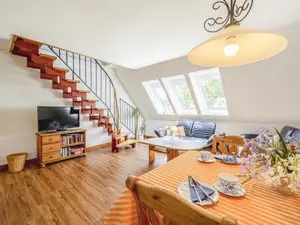 3-Raum-Wohnung im 1. Obergeschoß und Dachgeschoß, 70 qm. Wohnzimmer mit Couch, Sessel, Couchtisch, TV, Esstisch und 4 Stühle, Fußbodenbelag: Vinylparkett , Treppe zur Galerie mit Schlafbereich, Küchenzeile mit 4-Platten-Cerankochfeld, Backofen, Geschirrspülmaschine, Kühlschrank, Geschirr und Hausrat, Fliesenfußboden. Ein Schlafzimmer mit 2 Einzelbetten (90x190), Nachttische, Kleiderschrank, Fußbodenbelag: Vinyl-Parkett. Bad mit Dusche, Waschbecken und WC, Fußbodenbelag: Fliesen. Vom Wohnzimmer aus führt eine Treppe auf die Galerie mit Schlafraum (zum Wohnraum offen) mit Ehebett (2x90x200) Nachttische, Kleiderschrank, Fußbodenbelag: Teppich. Zur Wohnung gehört eine Sitzecke im Garten. Ein Kinderreisebettchen kann gestellt werden.Beschreibung der Unterkunft
