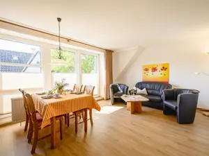2-Raum-Wohnung für max. 2 Erwachsene, 40qm DG und Spitzboden, mit Balkon. Wohnzimmer mit Couch, Sessel, TV, Esstisch mit 4 Stühlen, Fußbodenbelag: Vinylparkett, Kochnische mit 4-Platten-Cerankochfeld, Backofen, Geschirrspülmaschine. Schlafzimmer auf der Galerie: mit Ehebett (2x90x200), 1 Einzelbett (90x190), 2 Nachttischen, Kleiderschrank, Fußbodenbelag: Teppich. Bad mit Dusche, Waschbecken, WC, Fußbodenbelag: Fliesen. Ein Kinderreisebettchen kann gestellt werden. Ein Hund ist in dieser Wohnung nicht gestattet. Münzwaschmaschine und -trockner im Haus.Beschreibung der Unterkunft