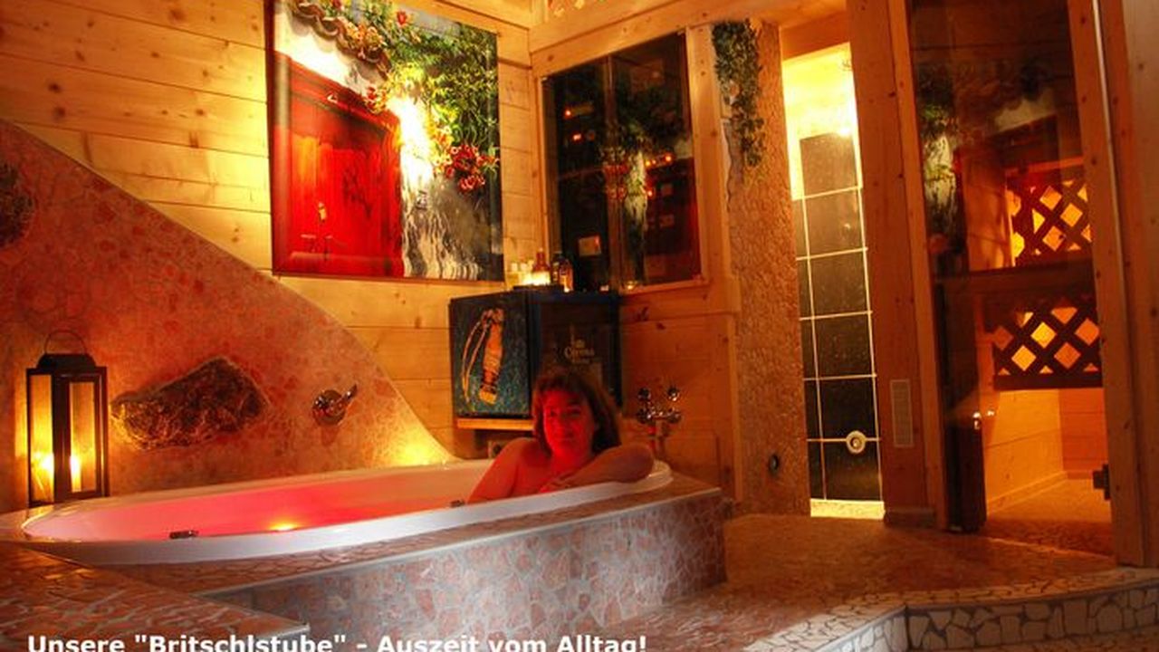 Übrigens: Unsere „Britsch'l-Stube“ (Holzblockhaus mit Sauna, Whirlpool, Lichttherapie etc.) wird separat für Sie angeheizt. Was gibt es schöneres, als 3-4 Std. zu zweit, bei stimmungsvoller Musik, in eine andere Sphäre zu gleiten.