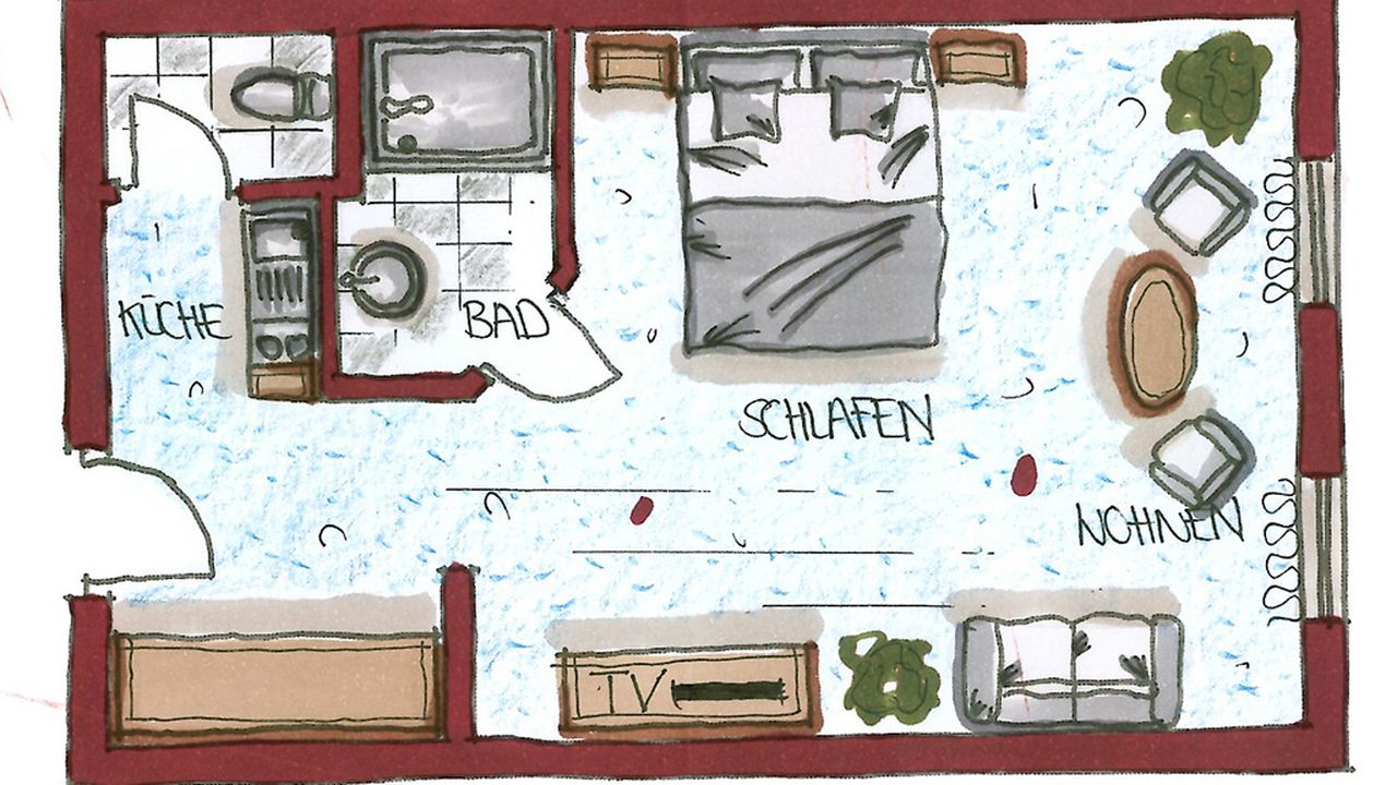 Ca. 40 qm für 2 Pers., komb. Wohn-/Schlafzimmer, Küche, Dusche, sep. WC, Sat-TV, Aufzug.Beschreibung der Unterkunft
