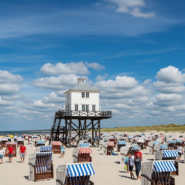 Häuser auf Pfählen, kilometerlanger, flach abfallender Strand, einzigartige Dünenlandschaft, Strandsegler – All das gepaart mit einer unglaublichen Naturkulisse inspirierte schon unzählige Künstler, Geschichtenerzähler und Filmemacher, das beschauliche St. Peter-Ording zu besuchen. Der Strand ist die eine attraktive Seite des Nordseeheil- und Schwefelbads St. Peter-Ording. An schönen Tagen kommen hier bis zu 20.000 Badegäste. Dabei findet sind trotz Andrang immer ein Plätzchen für weitere Gäste. Die Aufteilung des Strandes ist einfach gehalten. Im Süden befindet sich der Textilstrand, in der Mitte die Surfer und im Norden die Freie-Körper-Kultur. Für Kulturinteressierte bieten sich Ausflüge zum Böhler Leuchtturm, nach Westerhever mit Leuchtturm und Sandbank, zum Westüstenpark & Robbarium, zum Kinderspielhaus, zum Eidersperrwerk oder nach Tönning mit dem Multimar-Wattforum an.