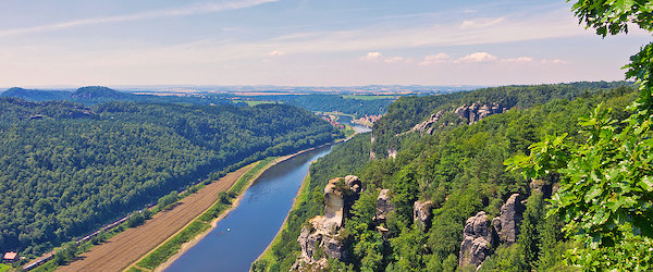 Die Bastei ist eine der bekanntesten Sehenswürdigkeiten der Sächsischen Schweiz und bietet atemberaubende Ausblicke auf die Elbe und die umliegenden Felsen. - Felsenbühne Rathen