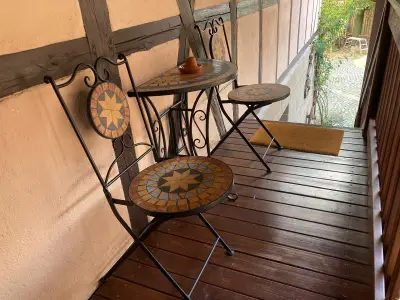 Ferienwohnung Eingang Haupthaus mit Parkplatz Durchgang zum Eingang der Ferienwohnung Schlüsselbox Blick auf den Freisitz gemütliche Sitzgelegenheit für warme Sommernächte oder Kaffee am Nachmittag Wohnzimmer Wohnzimmer Wohnzimmer