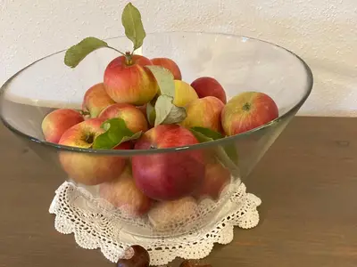 Der ganze Dreiseithof Eingang der Ferienwohnung Sitzgelegenheit auf der Empore Der Wohnraum Das Schlafsofa Wohlfühloase Küche und Esstisch im Wohnraum Früchte aus dem Garten Schlafzimmer Schlafzimmer